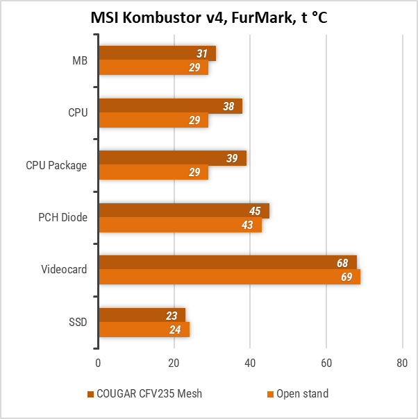 І нарешті в FurMark нагрівання відеокарти в корпусі було на 1°C нижчим, ніж на відкритому стенді. А от єдиний елемент, температура якого дійсно суттєво відрізнялася, — це процесор. Втім, йдеться про значення при мінімальному навантаженні, тоді як показники при більш значному ми вже бачили у тесті AIDA64.