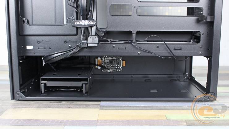 Для ще двох накопичувачів передбачено кошик з лотком у нижньому тунелі. Сюди поміститься пара жорстких дисків формату 3,5" або стільки ж більш компактних 2,5" носіїв. Праворуч є достатньо місця для монтажу 200-мм блока живлення, крім того наявні антивібраційні прокладки.