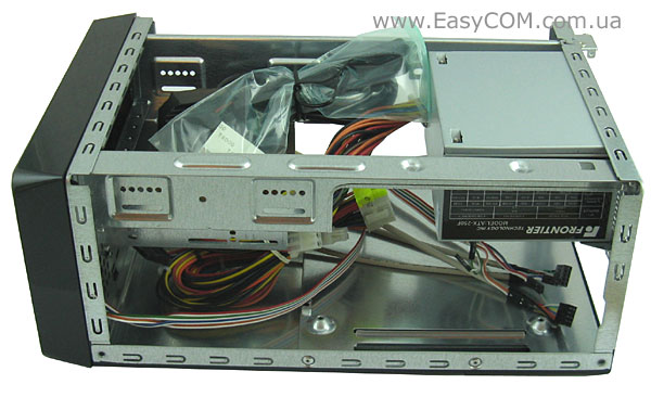 Передня частина корпуса Frontier МI-100 хоч і здається непропорційно великою, але в процесі складання буде вміщати відносно габаритний жорсткий диск 3.5" і привід 5.25", так що весь простір розрахований до кожного квадратного міліметра.