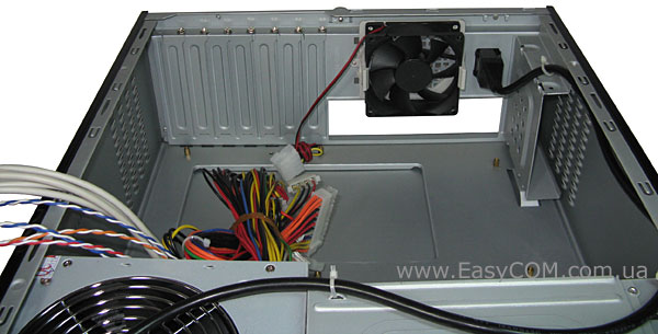 Відкрутивши два гвинти на задній стінці корпуса, вдалося зняти своєрідний кожух, у ролі якого виступає верхня та бічні стінки, що представляють єдину конструкцію. У задній частині корпуса досить масивно виглядає блок живлення, під яким є порожній простір, розрахований для материнської плати.