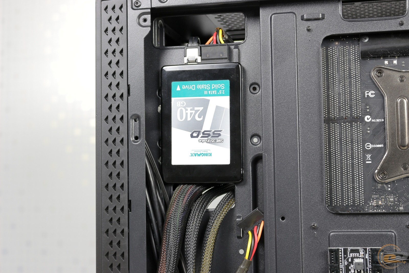 У Vinga Chaos можна встановити по парі SSD і HDD. Для 2,5-дюймових рішень знайдеться місце на піддоні для материнської плати і за ним. Жорсткі диски розташовуються в поперечному кошику. Кріплення здійснюється звичайними гвинтами з використанням комплектних гумових втулок. Але таке рішення не дозволяє розміщувати тут накопичувачі меншого формату.