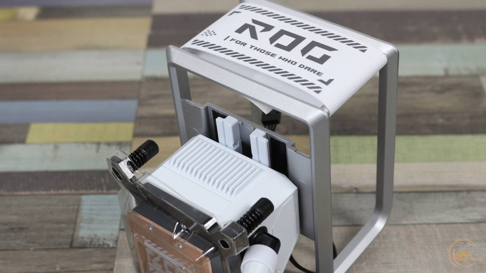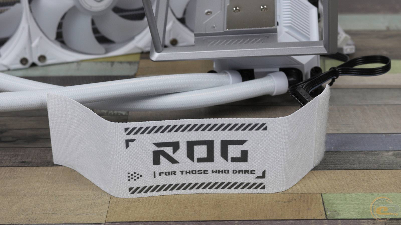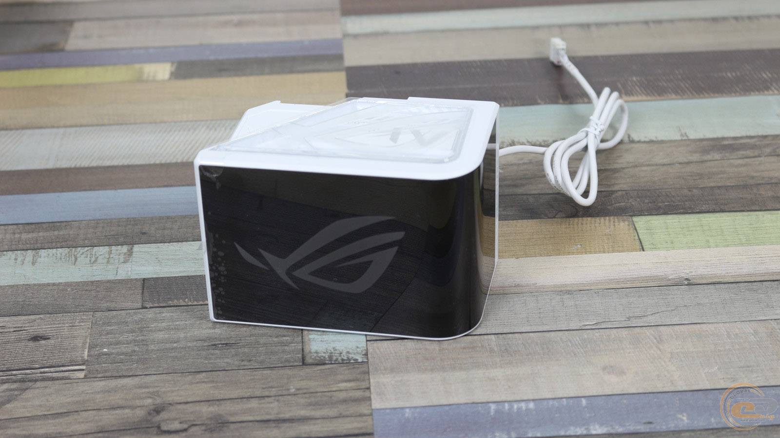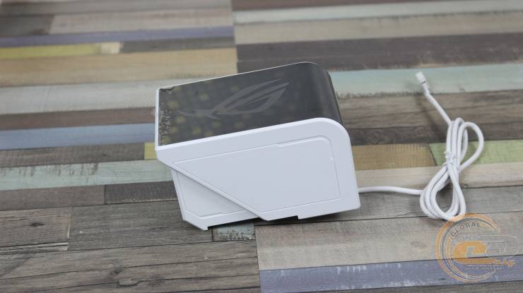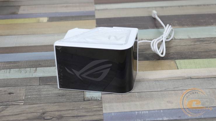 На одній з її граней знаходиться біла стяжка на липучці з логотипом ROG та фірмовим гаслом «FOR THOSE WHO DARE».