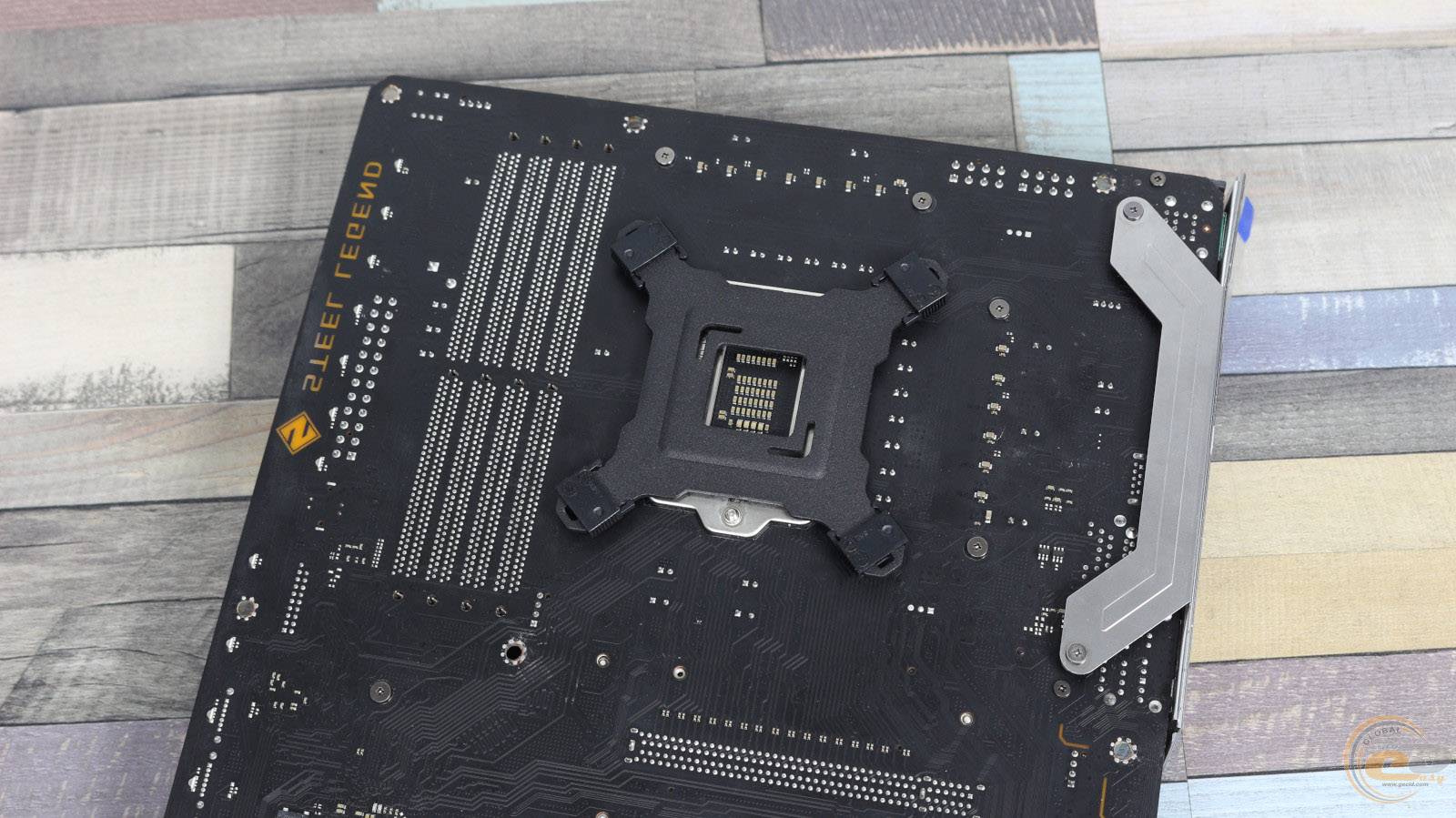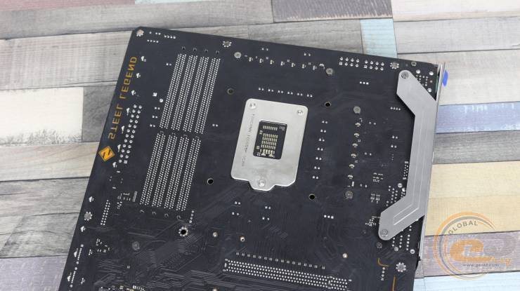 У комплекті постачання ми знаходимо підсилювальну пластину для роз’ємів Intel, розміщуємо на ній фіксатори у потрібному для сокету Intel LGA1200 положенні та прикладаємо її до отворів кріплення на звороті материнської плати.