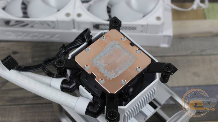 Квадратна мідна основа водяного блоку має добре поліровану поверхню, скошені кути та незначне заглиблення у формі кола. Шліфування тут йде концентричними колами від центру. Розміри основи становлять 55 х 55 мм, а зафіксована вона вісьмома гвинтами типу «Torx».