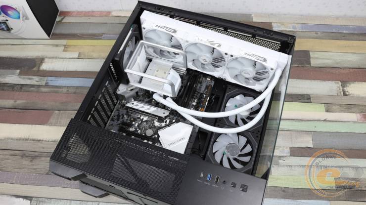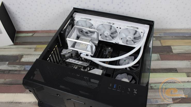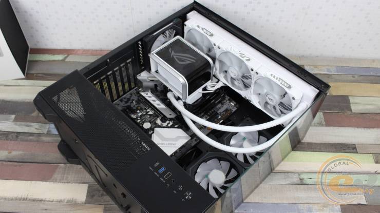 Для перевірки ефективності роботи ASUS ROG Ryuo IV 360 ARGB White Edition та її опонентів був задіяний корпус Zalman CHRONIX V2 BLACK. Його тильний вентилятор був встановлений на видув, а два реверсивних на бічній панелі – на вдув. Усі вони працювали зі швидкістю 1600 об/хв. Температура повітря у приміщенні тестової лабораторії у цей момент була рівна 23°С.