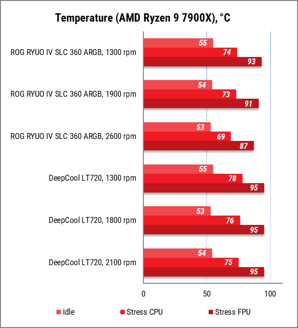 ASUS ROG Ryuo IV SLC 360 ARGB виявилася значно ефективнішим варіантом за і так доволі непогану РСО DeepCool LT720. З роботою вентиляторів всього на 1300 об/хв вона до 2°C краще охолоджувала процесор, ніж конкурент від DeepCool, що працював на максимумі своїх можливостей. При цьому ситуація ніяк не змінювалася від обраного сценарію навантаження. Якщо ж змусити обидві РСО працювати на максимальних обертах - різниця на користь героїні огляду уже досягає 8°C.