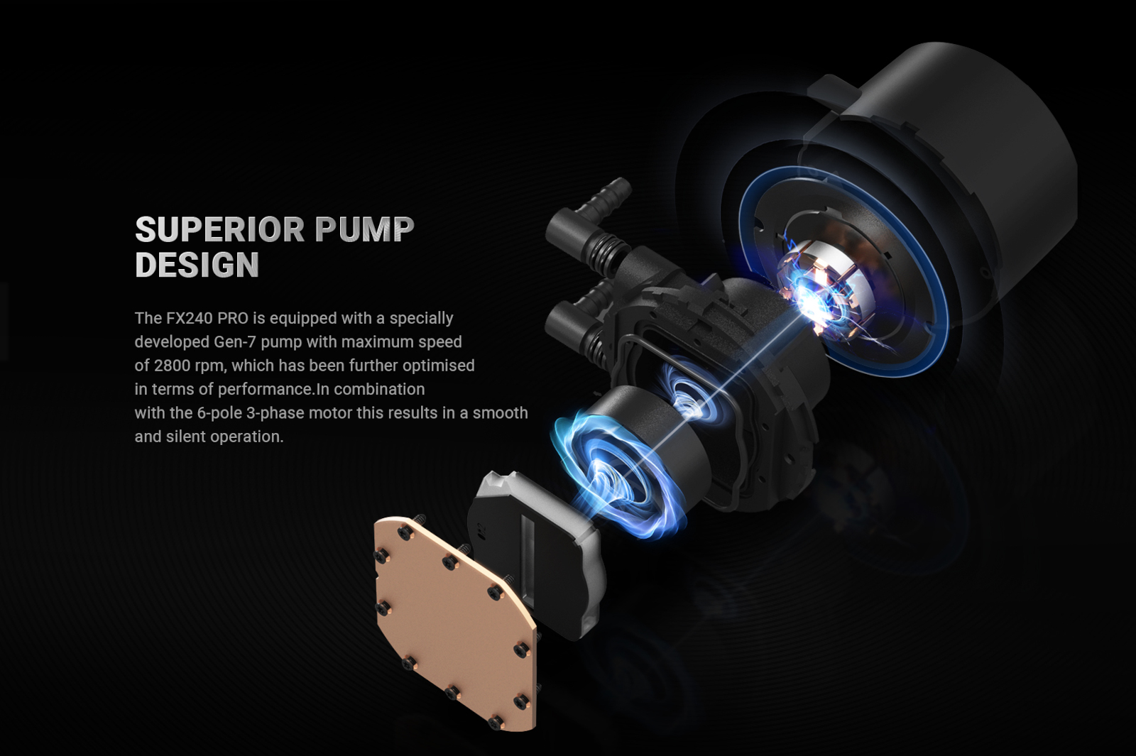 Всередині водоблока знаходиться помпа сьомого покоління від Asetek, що оснащена 6-полюсним 3-фазним моторчиком, що працює на постійній швидкості 2800 ± 10% об/хв із рівнем шуму 25 дБ(А).