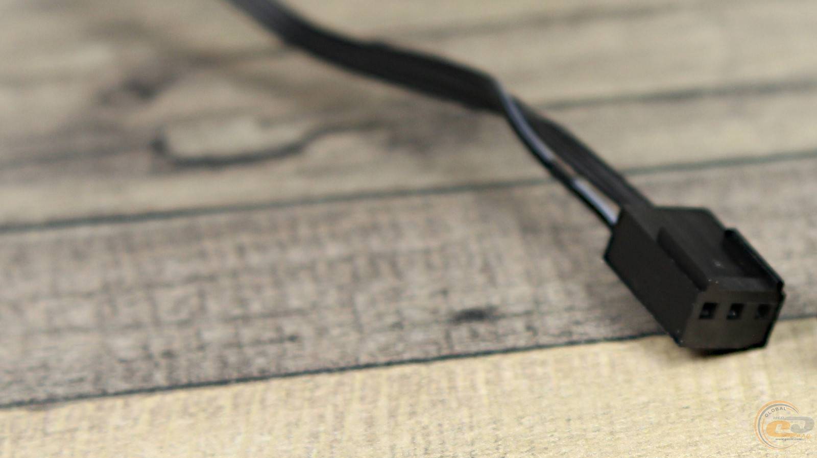 Для подачі живлення на кожному вентиляторі маємо 4-контактний кабель без обплетення завдовжки 10 см зі штекером для послідовного з’єднання. Для зручнішого під’єднання їхнього живлення до материнської плати чи контролера у комплекті постачання наявний окремий подовжувач завдовжки 55 см.