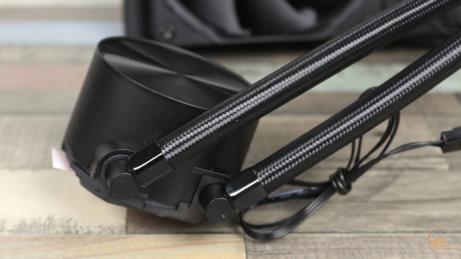 Якимись незвичними конструктивними елементами ID-COOLING FX240 PRO вас не здивує, адже за будовою це класична РСО, що не обслуговується. Її гумові шланги в нейлоновому обплетенні мають довжину 400 мм. Як ми вже зазначали, компанія ID-COOLING у цій моделі відмовилася від будь-яких ARGB-елементів. Проте через те, що кожна деталь є виключно чорною, виріб ніби набуває додаткової простоти та лаконічності.