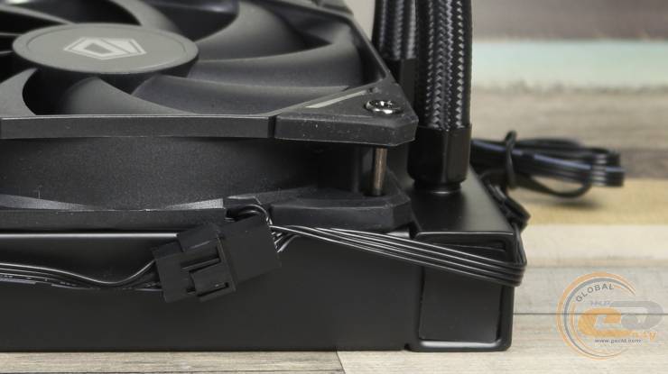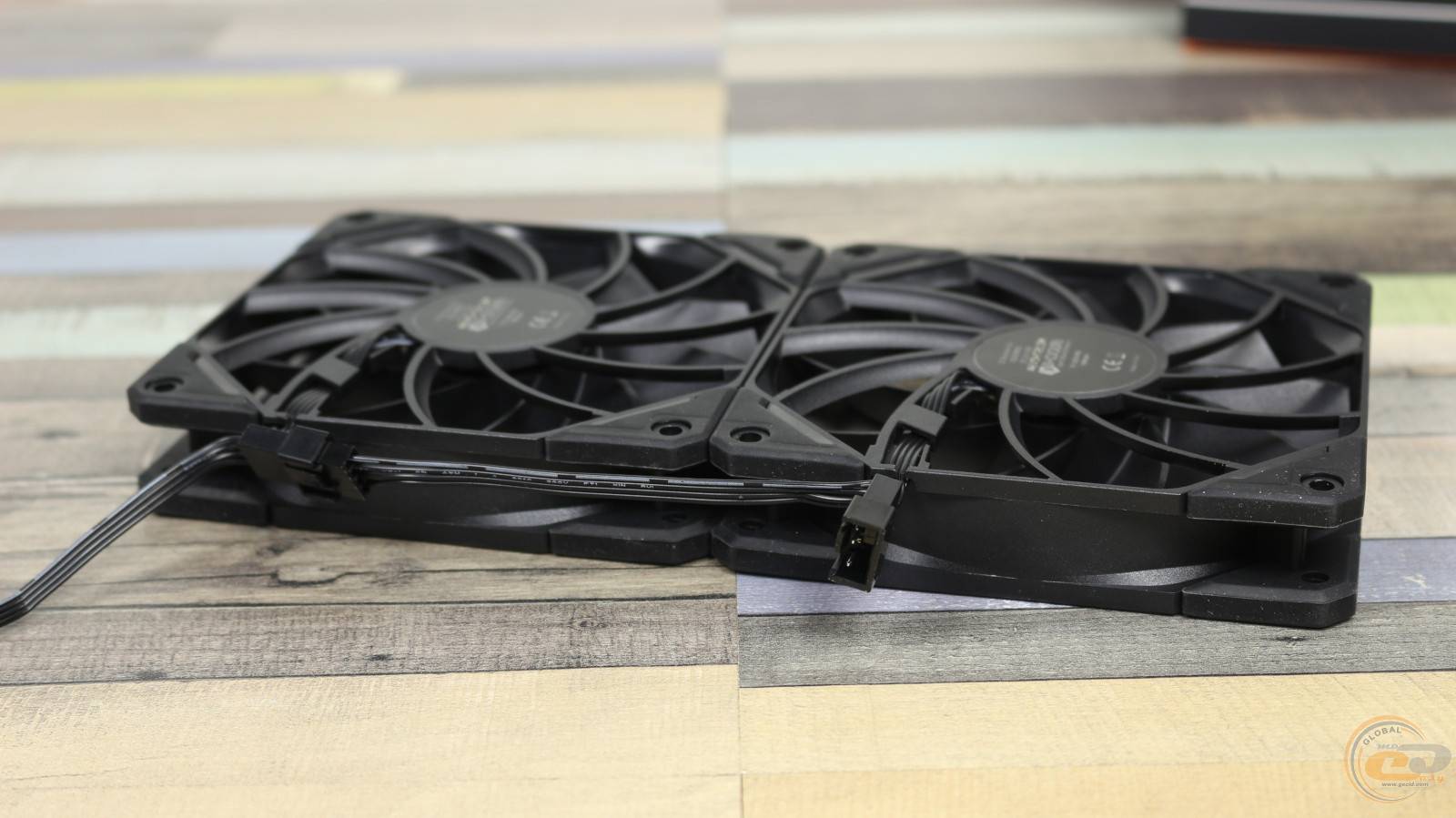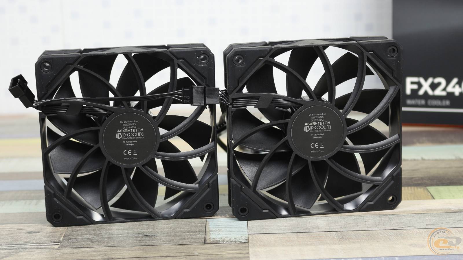 Радіатор обдувають два 120-мм вентилятори ID-COOLING TF-12025-PRO BLACK (ID12025M12S) із дев’ятьма лопатями. Внутрішня рамка, яка більше нагадує восьмикутник завдяки чітко вираженим граням, стилістично вирізняє ці вертушки від більшості варіантів, наявних на ринку.