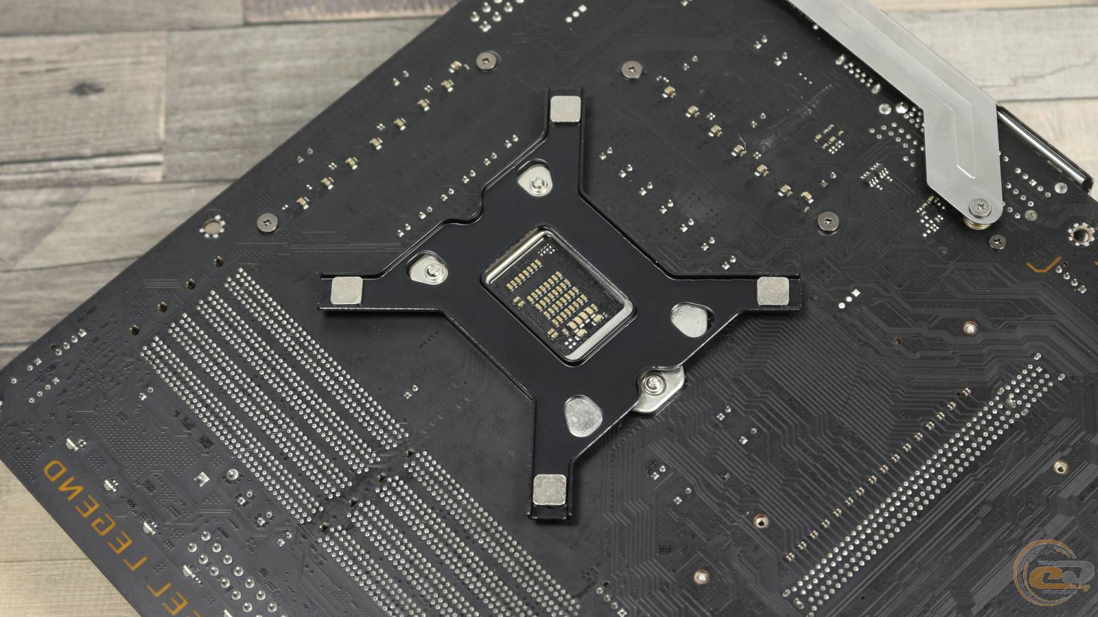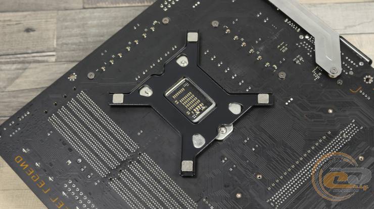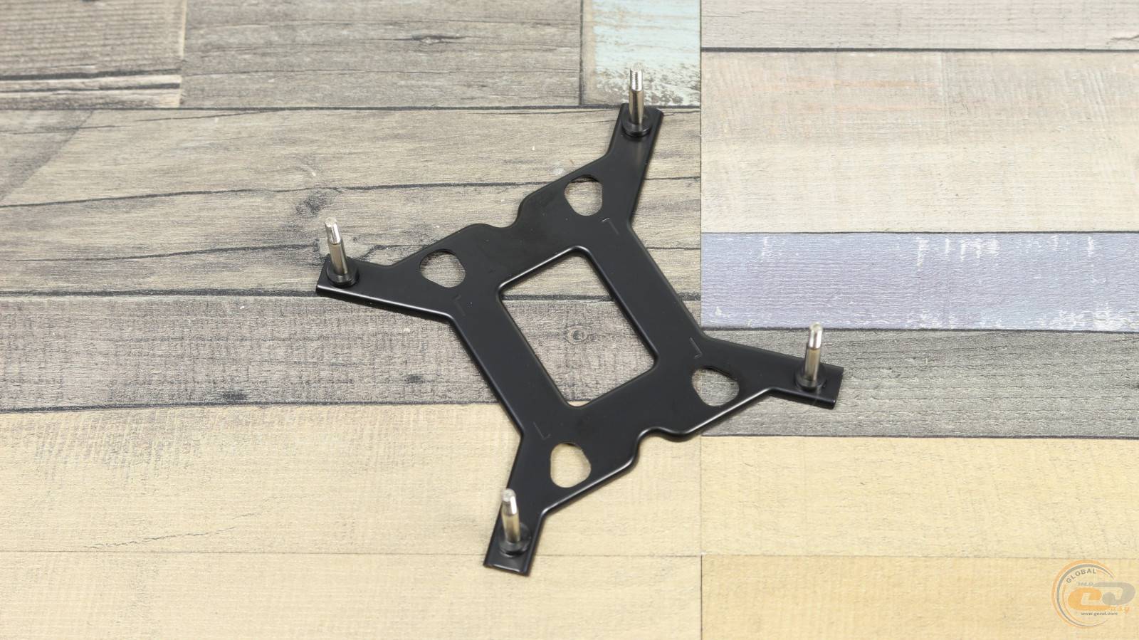 У комплекті знаходимо підсилювальну пластину для кріплень сокетів Intel і розміщуємо на ній фіксатори у відповідному для сокету Intel LGA1200 положенні. Після цього прикладаємо її до відповідних отворів кріплення на звороті материнської плати.