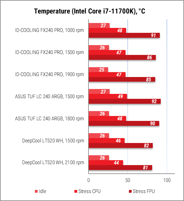ID-COOLING FX240 PRO приємно здивувала, адже серед відчутно дорожчих 240-мм опонентів її ефективність виявилась лише трохи гіршою за DeepCool LT520 WH. При цьому у ASUS TUF LC 240 ARGB просто не залишилось жодних шансів, адже при аналогічних 1500 об/хв на обох РСО героїня нашого огляду забезпечувала нижчу на 6°C температуру у найтяжчому сценарії тестування.