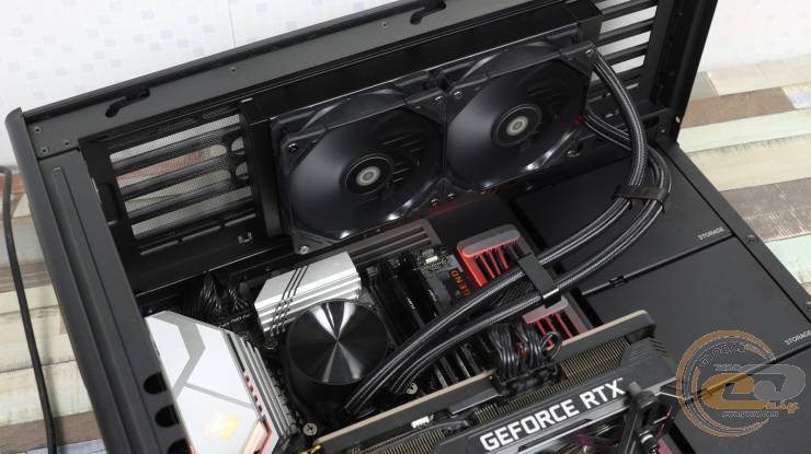 Під час тестування продуктивності ID-COOLING FX240 PRO у корпусі на тильній панелі нами було встановлено два вентилятори be quiet! PURE WINGS 3 140mm PWM high-speed (один на видув та один – на вдув). Додатково на нижній панелі ми розмістили три 140-мм вертушки be quiet! PURE WINGS 3 у положенні на вдув. Обидва тильні вентилятори працювали зі швидкістю 1800 об/хв, а три нижні – 1200 об/хв. Температура повітря у приміщенні тестової лабораторії на момент проведення вимірювань становила 18°С.
