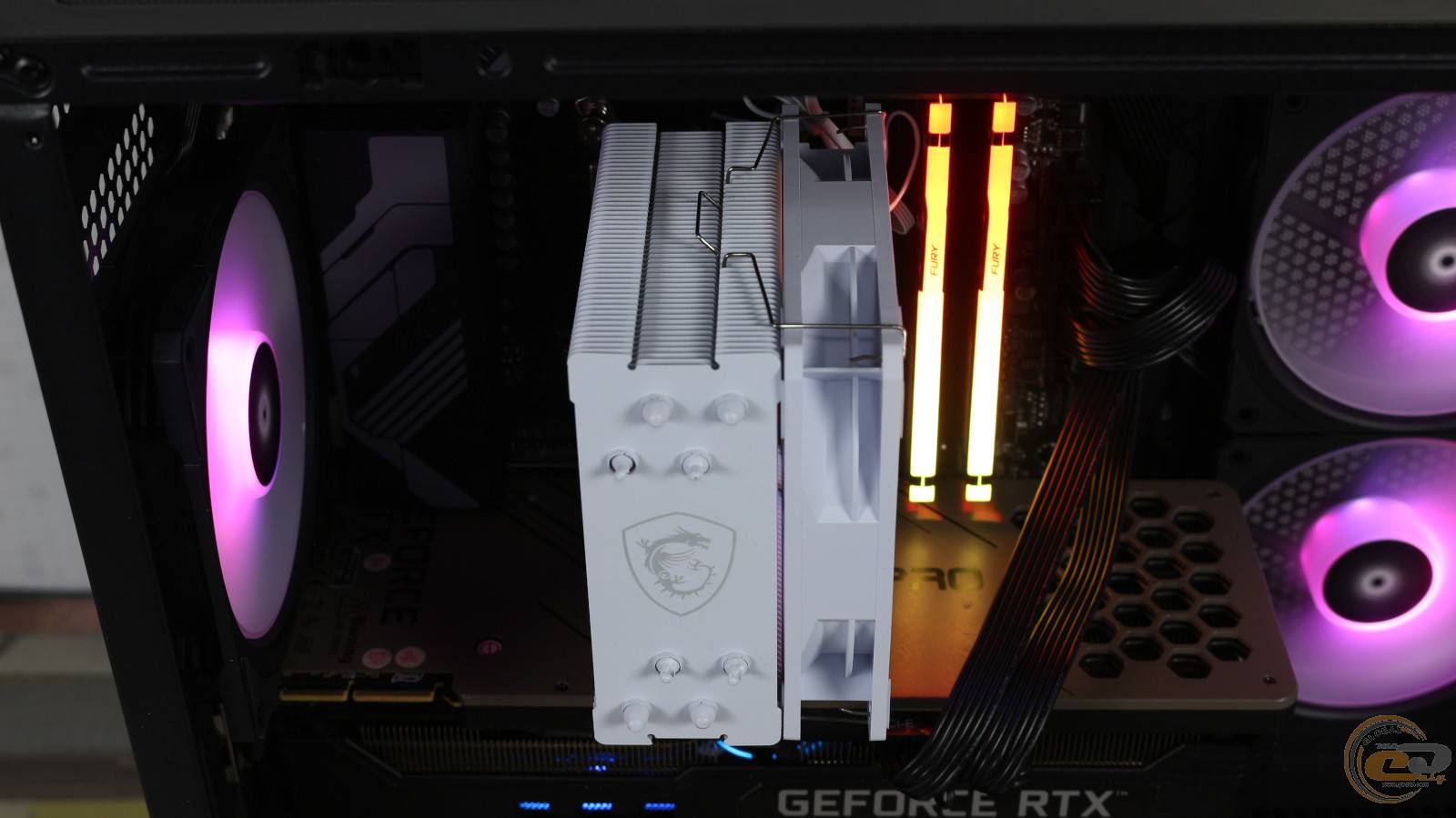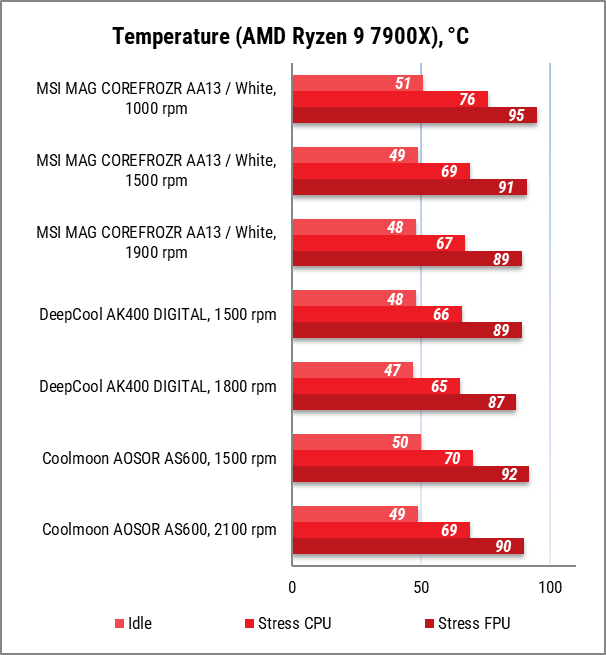 Під час тестування ефективності роботи MSI MAG COREFROZR AA13 WHITE задній вентилятор у корпусі встановлювався на видув, а два, які розміщені на бічній панелі – на вдув. Усі вони працювали зі швидкістю 1600 об/хв. При цьому температура навколишнього середовища становила 21°С.