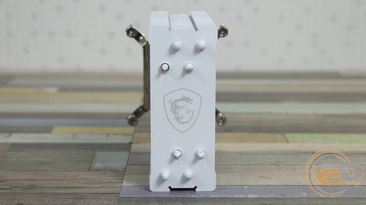 Верхня частина MSI MAG COREFROZR AA13 WHITE може бути цікавою для користувача хіба що вигравійованим лазером на верхній пластині логотипом з драконом MSI, який також дасть невелику підказку щодо правильного встановлення цієї системи охолодження у корпусі.