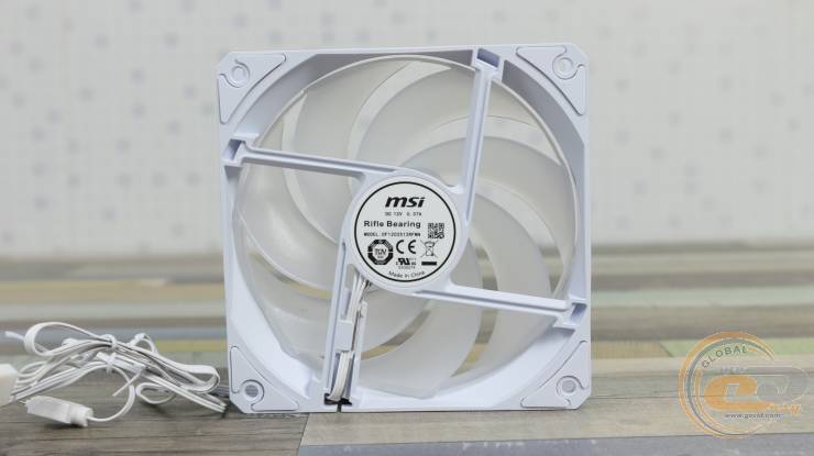 Швидкість обертання лопатей можна регулювати через ШІМ у діапазоні 510 – 2070 ± 10% об/хв із максимальним рівнем шуму до 34,1 дБ(А) включно. Для цього вентилятора компанія MSI заявляє максимальний повітряний потік на рівні 62,6 CFM (106,36 м3/год), а статичний тиск - 2,36 мм вод. ст. Виробник застосував у цій вертушці підшипник ковзання з гвинтовою нарізкою (Rifle Bearing), який за температури навколишнього середовища 40°С повинен відпрацювати 40 000 годин.