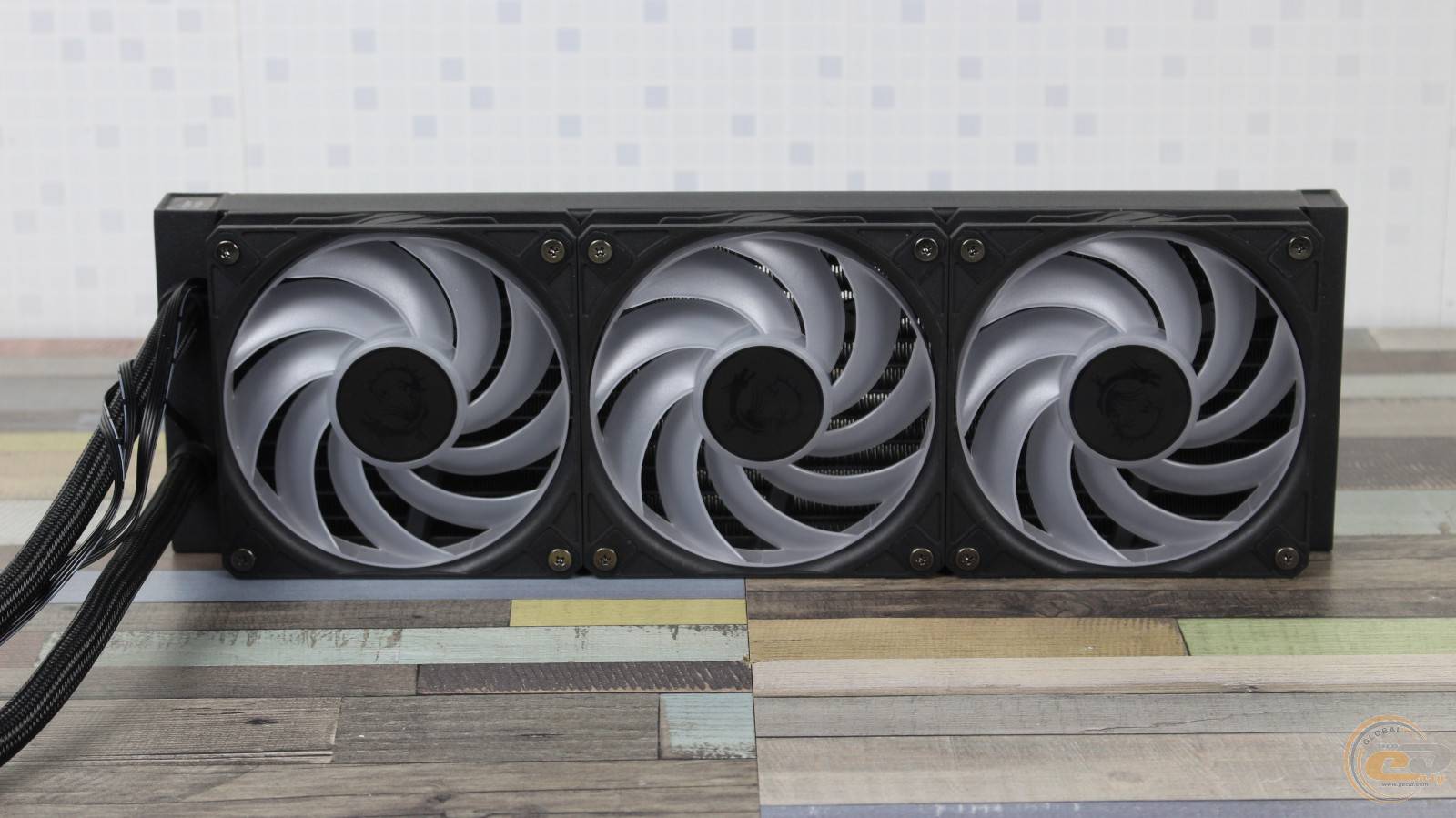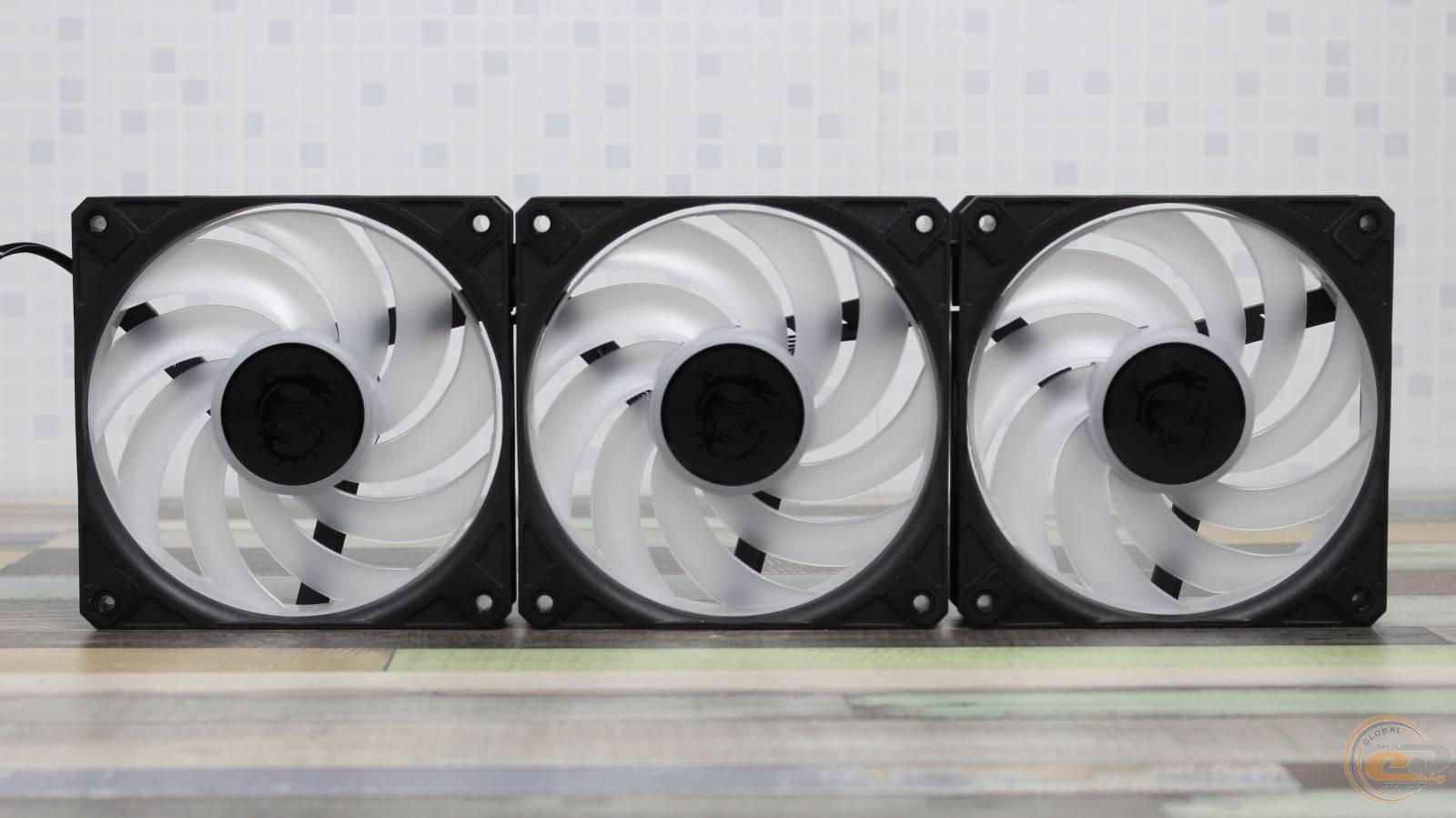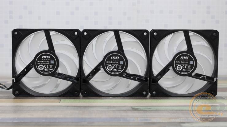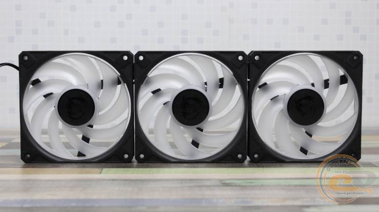 Радіатор обдувають три 120-мм вентилятори MSI DF1202512RFMN із дев’ятьма лопатями, які об’єднані кільцем на кінцях (конструкція CycloBlade 9). Вертушки отримали класичні габарити – 120 х 120 х 25 мм.