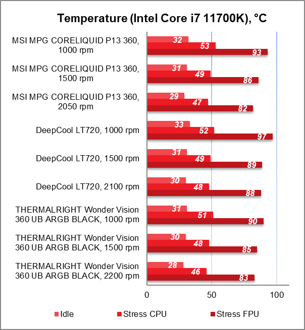 У порівнянні з DeepCool LT720 перевага MSI MPG CORELIQUID P13 360 помітна одразу. При цьому різниця температур на користь останньої варіюється від 3°C до 6°C у найважчому сценарії навантаження.