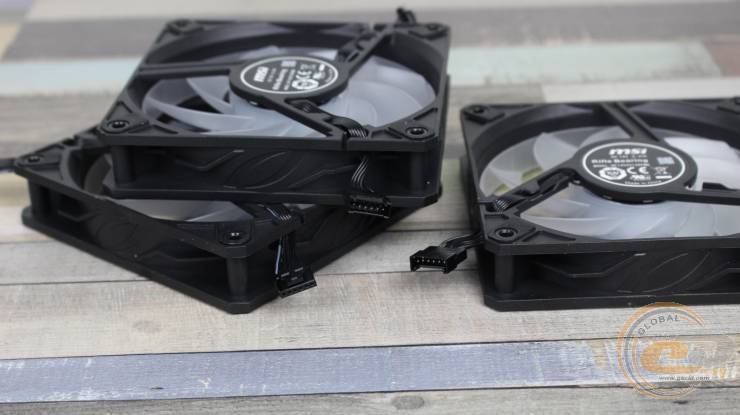Для живлення та підсвічування кожен комплектний вентилятор використовує нестандартний 6-контактний кабель без обплетення завдовжки близько 10 см. Між собою вони з’єднані послідовно. А вже від крайньої вертушки йде кабель без обплетення довжиною 80 см зі штекером MSI EZ Сonn.