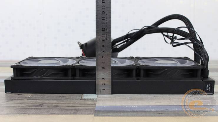 Товщина системи разом із вентиляторами, враховуючи головки гвинтів кріплення, досягає 56 мм у профіль.