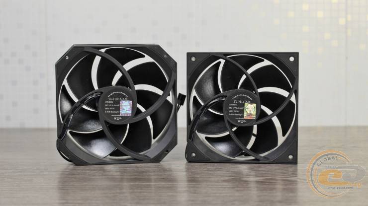 Почнемо зі 120-мм вентилятора Thermalright TL-H12-X28. Він отримав сім лопатей, чорний корпус із трохи шорсткою поверхнею та чорними гладкими лопатями. Його фактичні габарити становлять 120 х 120 х 28 мм. Бічні грані стилізовані подібно до декоративних пластин радіатора. У кутах з обох сторін розташовані гумові демпфери для зменшення вібрації. Підтримка ШІМ-регулювання дозволяє змінювати швидкість обертання лопатей у діапазоні 0 – 2150 ± 10% об/хв із максимальним рівнем шуму до 29,4 дБ(А) включно. Заявлений максимальний повітряний потік цієї моделі становить 80,45 CFM (136,68 м3/год), а статичний тиск дорівнює 2,65 мм вод. ст. В його основі лежить гідродинамічний підшипник.