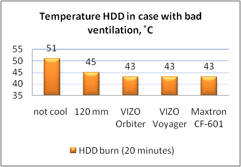 Власне, за ефективністю охолодження VIZO Voyager мало чим відрізняється від інших протестованих нами HDD-кулерів, бо всі вони створюють приблизно рівний повітряний потік. Якщо ж порівнювати з іншими видами охолодження накопичувачів, то згідно графіку помітна перевага індивідуальних систем. І у випадку використання більш гарячішого жорсткого диску можна чекати ще більшої різниці. Хоча у вентилятора на передній панелі є і своя перевага - він здатний охолоджувати декілька накопичувачів одночасно.