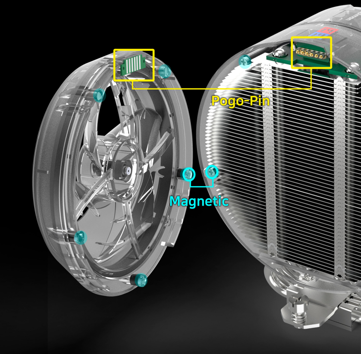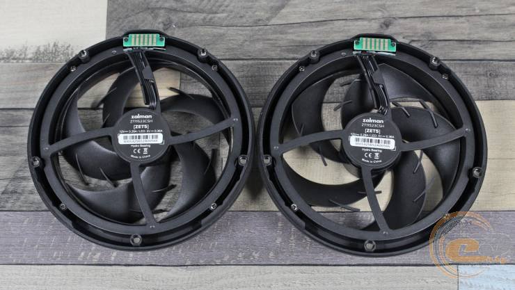 Два вентилятори ZALMAN ZT11523CSH отримали незвичну круглу рамку, яка гармонійно відповідає формі радіатора. Їх діаметр становить 115 мм, а товщина — 23 мм. Попри зовнішню схожість, вони дещо відрізняються: один із них реверсивний, що логічно для організації наскрізного продування. У конструкції застосовано гідравлічні підшипники з ресурсом 40 000 годин.