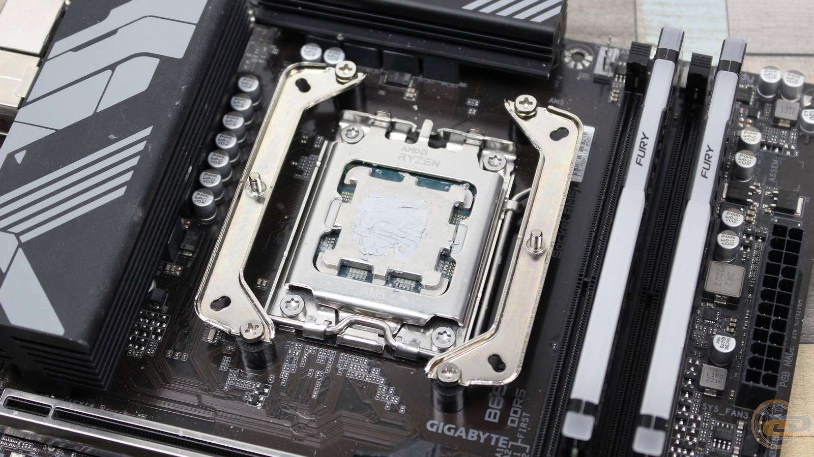 Замість нього на лицьовій стороні материнської плати встановлюються чотири стійки для платформи AMD, а поверх них фіксується пара універсальних кронштейнів.