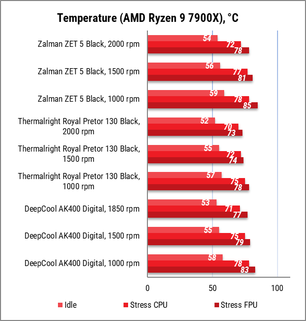 В нашому порівнянні кулер ZALMAN ZET 5 BLACK показав найнижчі результати, поступившись навіть одновентиляторному DeepCool AK400 DIGITAL. Втім, з огляду на зменшену заради дизайну площу радіатора та діаметр вентиляторів 115 мм, це цілком очікувано.