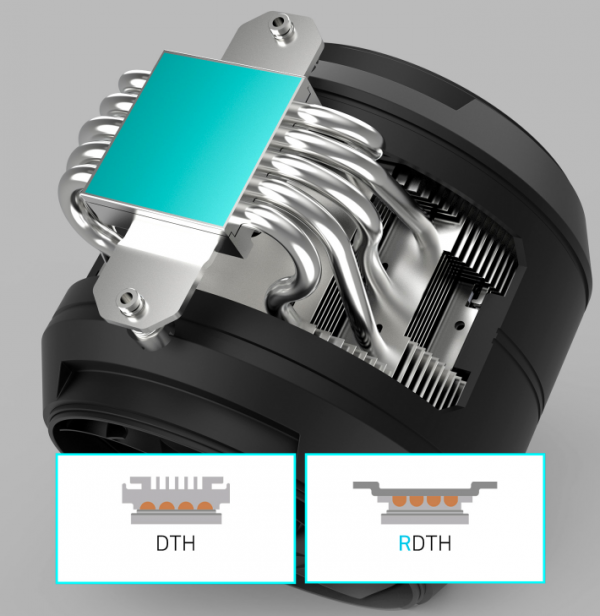 У конструкції застосовано технологію RDTH (Reverse Direct Touch Heatpipe) — зворотний прямий контакт теплових трубок із процесором. На відміну від класичної DTH-схеми, де відшліфовані трубки безпосередньо прилягають до теплорозподільної кришки процесора, RDTH завдяки особливому їх розташуванню забезпечує більшу площу розсіювання тепла. Це знижує тепловий опір, підвищує ефективність охолодження та дозволяє кулеру впевнено справлятися навіть із потужними процесорами під високим навантаженням.