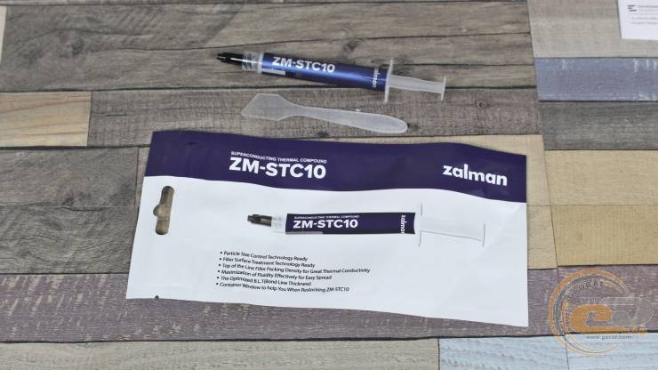 Саме час нанести термопасту. У комплекті постачається шприц із ZALMAN ZM-STC10. Нам не вдалося знайти її тестів у мережі, проте попередня версія — ZALMAN ZM-STC9 із теплопровідністю 9,1 Вт/(м·K) — демонструвала результати на рівні Arctic MX-5 та Thermalright TF6. Тож десята версія з показником 11,5 Вт/(м·K) повинна бути ще ефективнішою. До того ж у комплекті є лопатка для зручного нанесення.