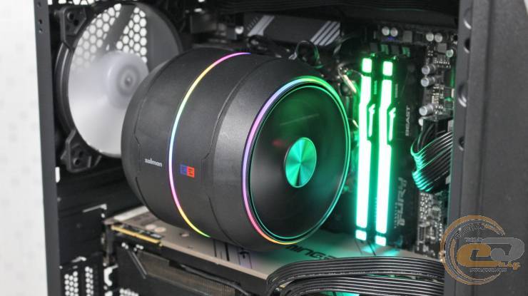 Зовні радіатор із вентиляторами виглядає як одне ціле. Магнітне кріплення значно спрощує складання, а загалом процес монтажу дуже простий. При цьому три кільця підсвітки створюють яскравий візуальний ефект. Втім, існує обмеження за висотою модулів пам’яті — у перший слот можна встановити модуль висотою до 42 мм.