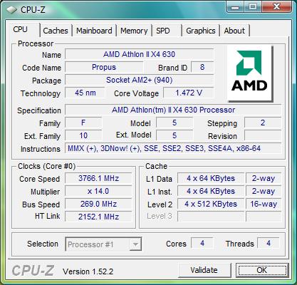 Застосовуючи стандартний алгоритм розгону процесорів AMD і збільшивши напругу живлення до 1,472 В, ми змогли досягти стабільної роботи процесора AMD Athlon II X4 630 на частоті 3766 МГц, що на 34,5% вище номіналу.