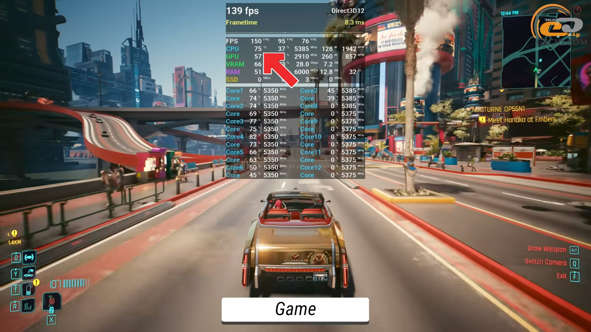 На ігровому прикладі в Cyberpunk 2077 бачимо, що температури трохи падають і не перевищують 75 градусів, при цьому супроводжували це робочі частоти близько 5,4 ГГц.