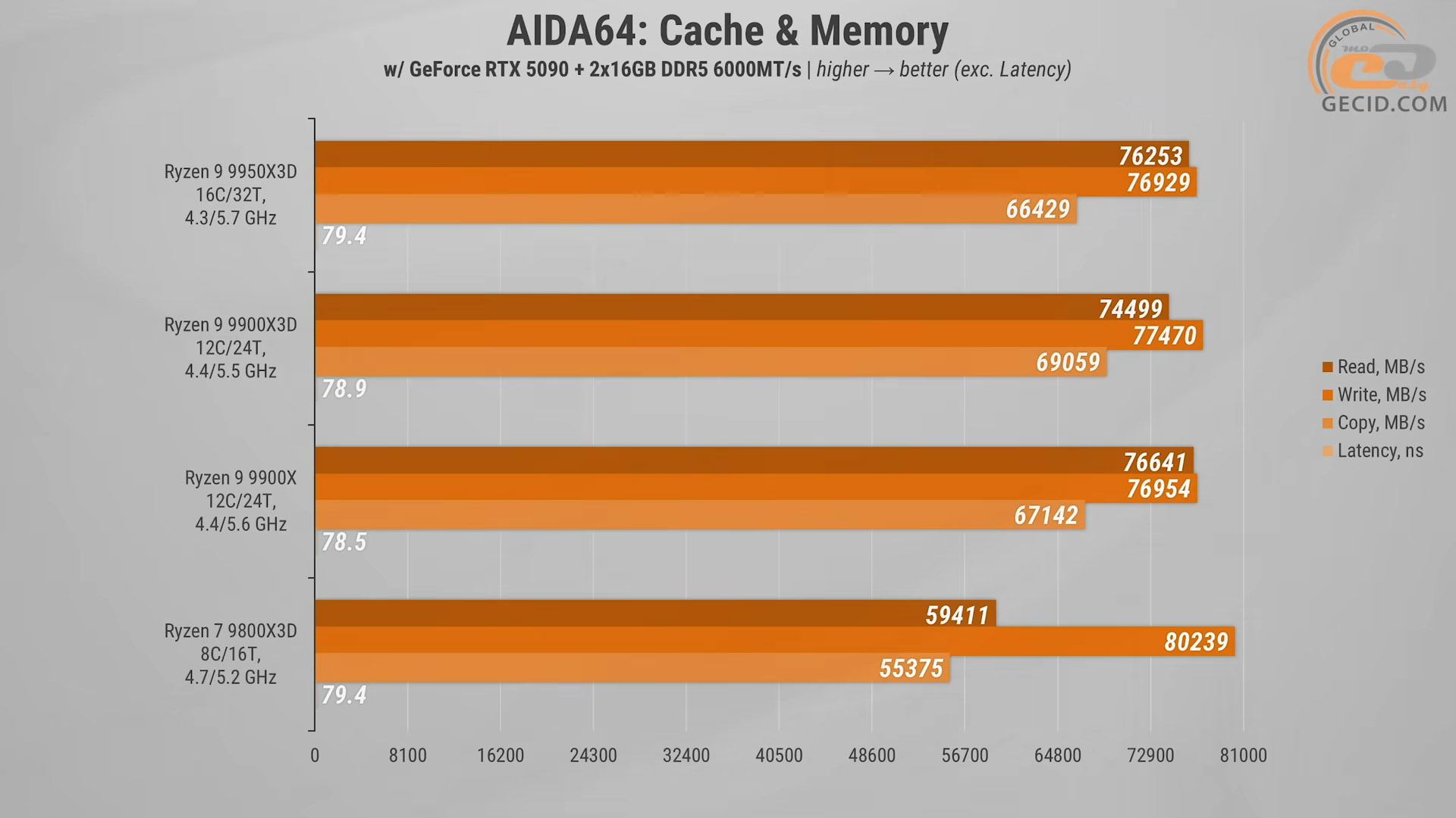 У тестах роботи з пам’яттю Ryzen 9 9900X3D показав швидкодію на рівні з іншими двочиплетними рішеннями серії, плюс-мінус похибка.