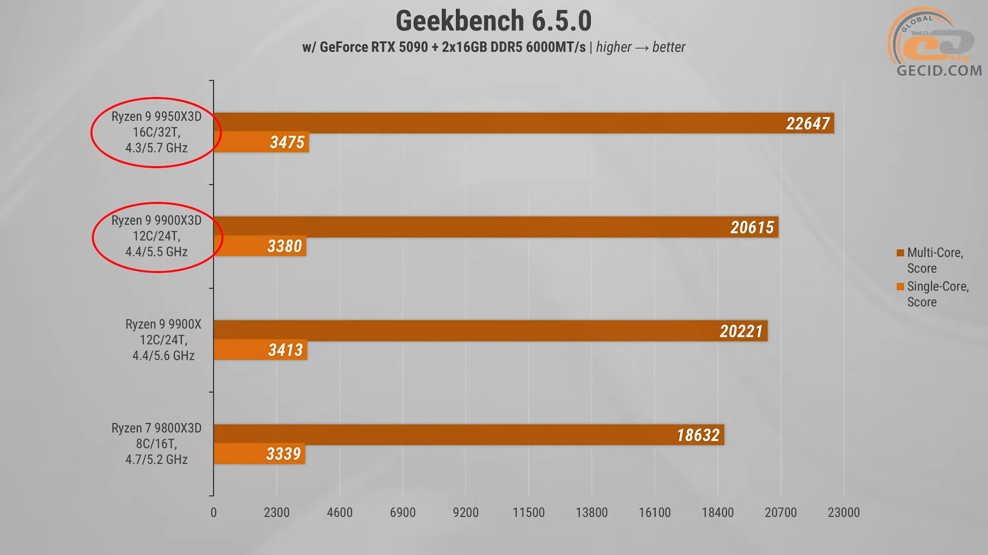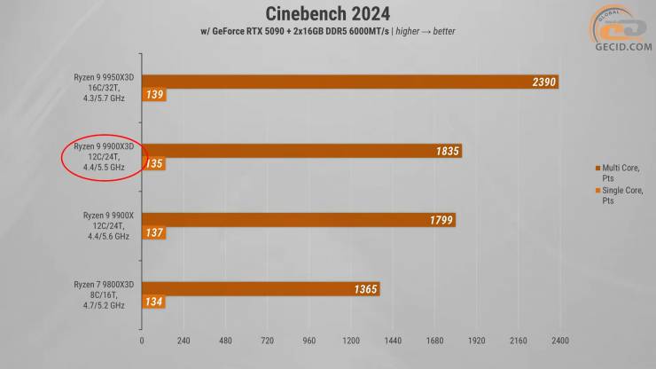 У Geekbench 6 піддослідний процесор знову забирає срібну медаль. Відставання від флагмана мінімальне — близько 9% у мульти-ядерному навантаженні та лише 3% в однопотоці. Цікаво, що результат практично збігся зі звичайним 9900X — різниця менше 2%. Водночас перевага над Ryzen 7 9800X3D цілком відчутна — коло 10%.
