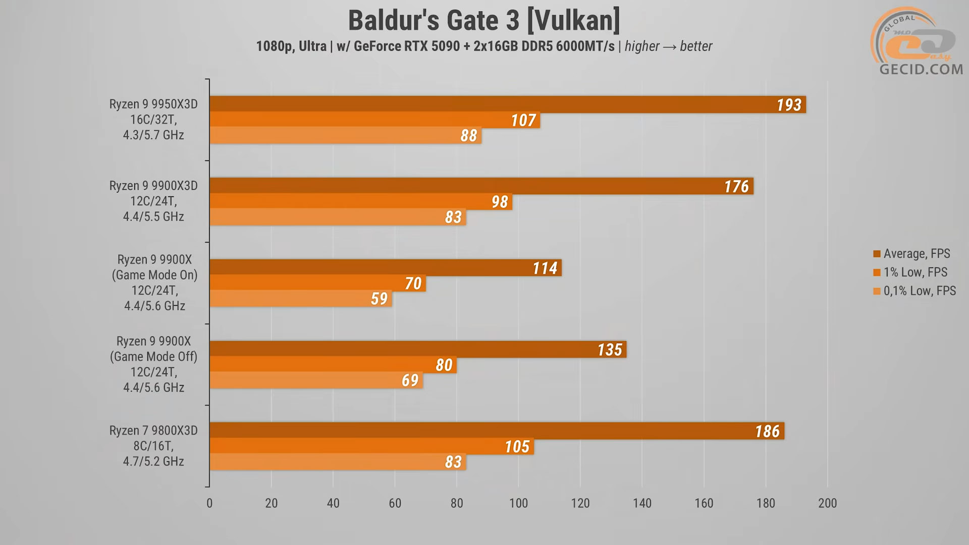 Під час проходження Baldur’s Gate 3, особливо в щільних вуличках третього акту з великою кількістю NPC, процесор грає ключову роль. Тут Ryzen 9 9900X3D показав очікувано непоганий результат. Від флагманського Ryzen 9 9950X3D він відстає зовсім небагато — приблизно 9% по середньому FPS і 8% за мінімальними кадрами.