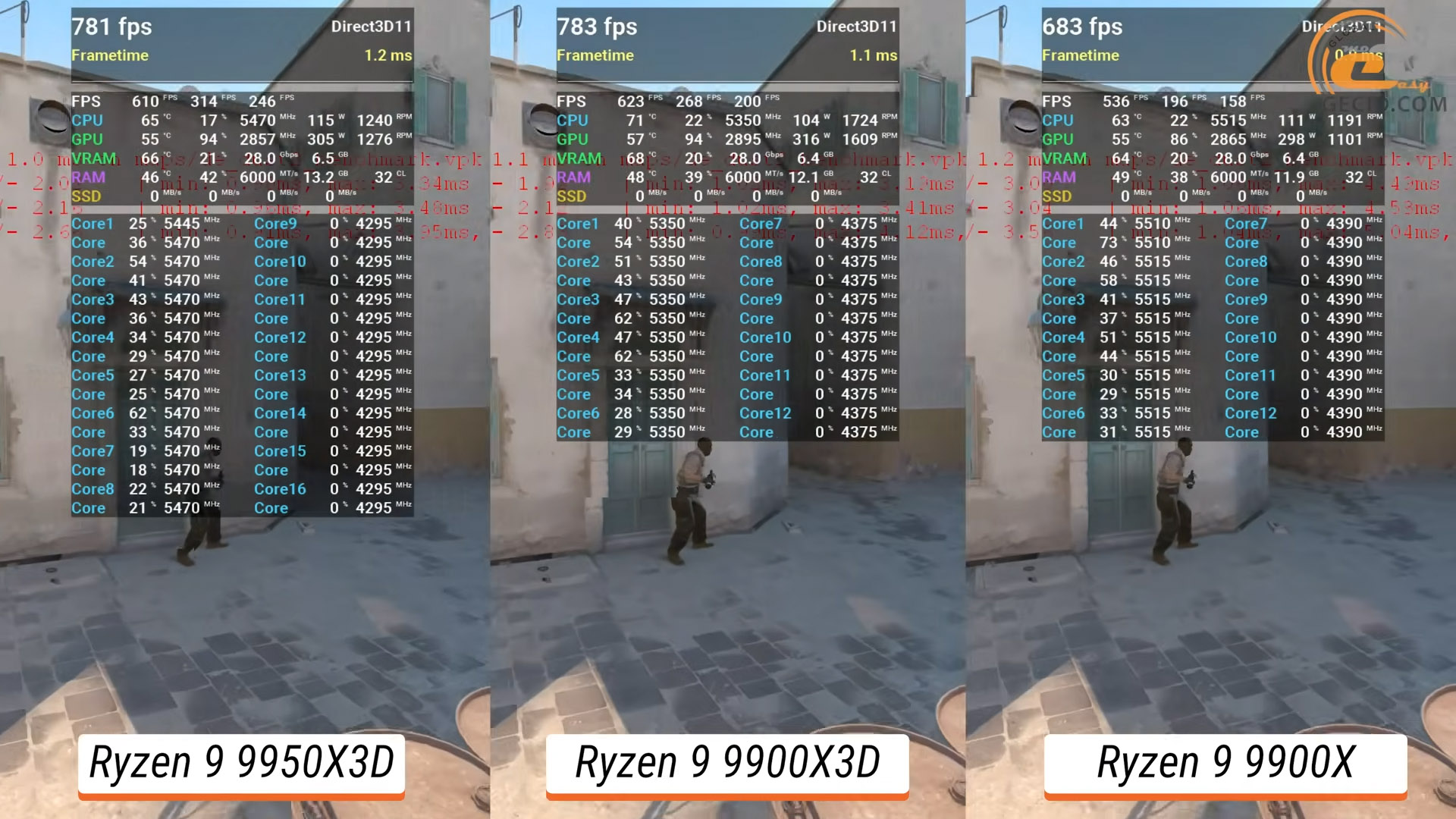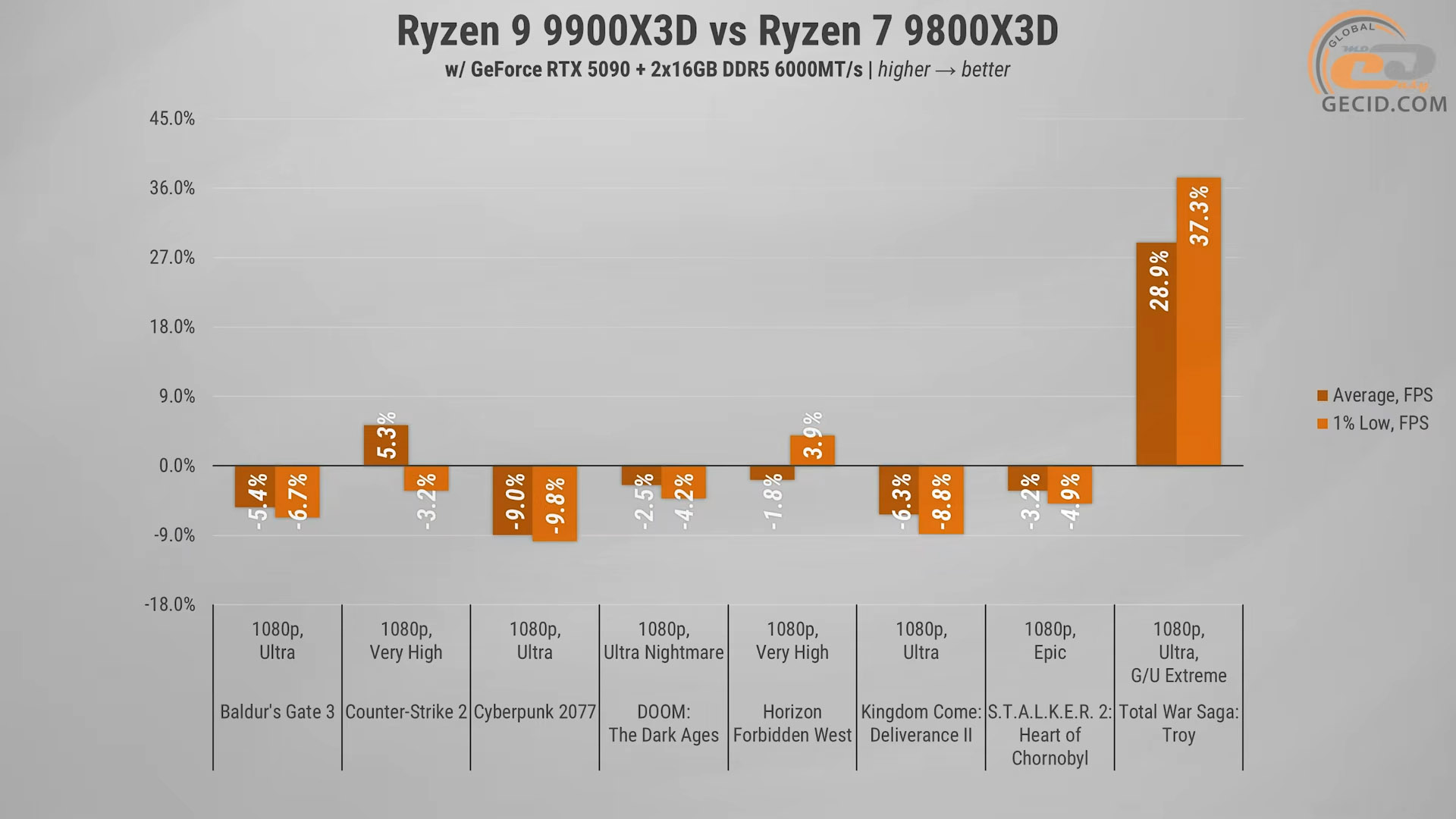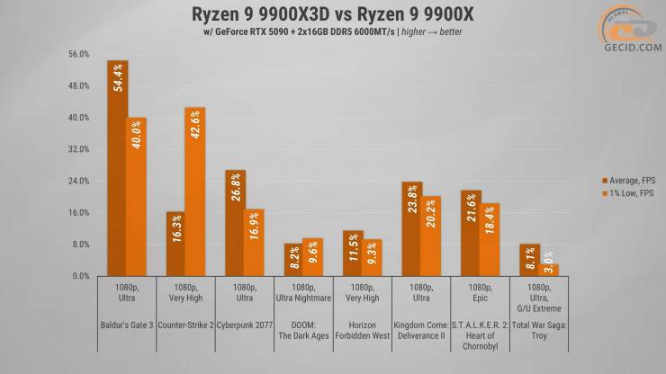 Натомість проти звичайного Ryzen 9 9900X різниця просто колосальна — 54%. Тут 3D-кеш реально творить магію — гра відчутно стабільніша й плавніша. А ось із Ryzen 7 9800X3D маємо практично однаковий результат: відрив в межах 5% в користь одночиплетного представника, тож навіть 8 ядер з 3D-кешем тримаються на конкурентному рівні.