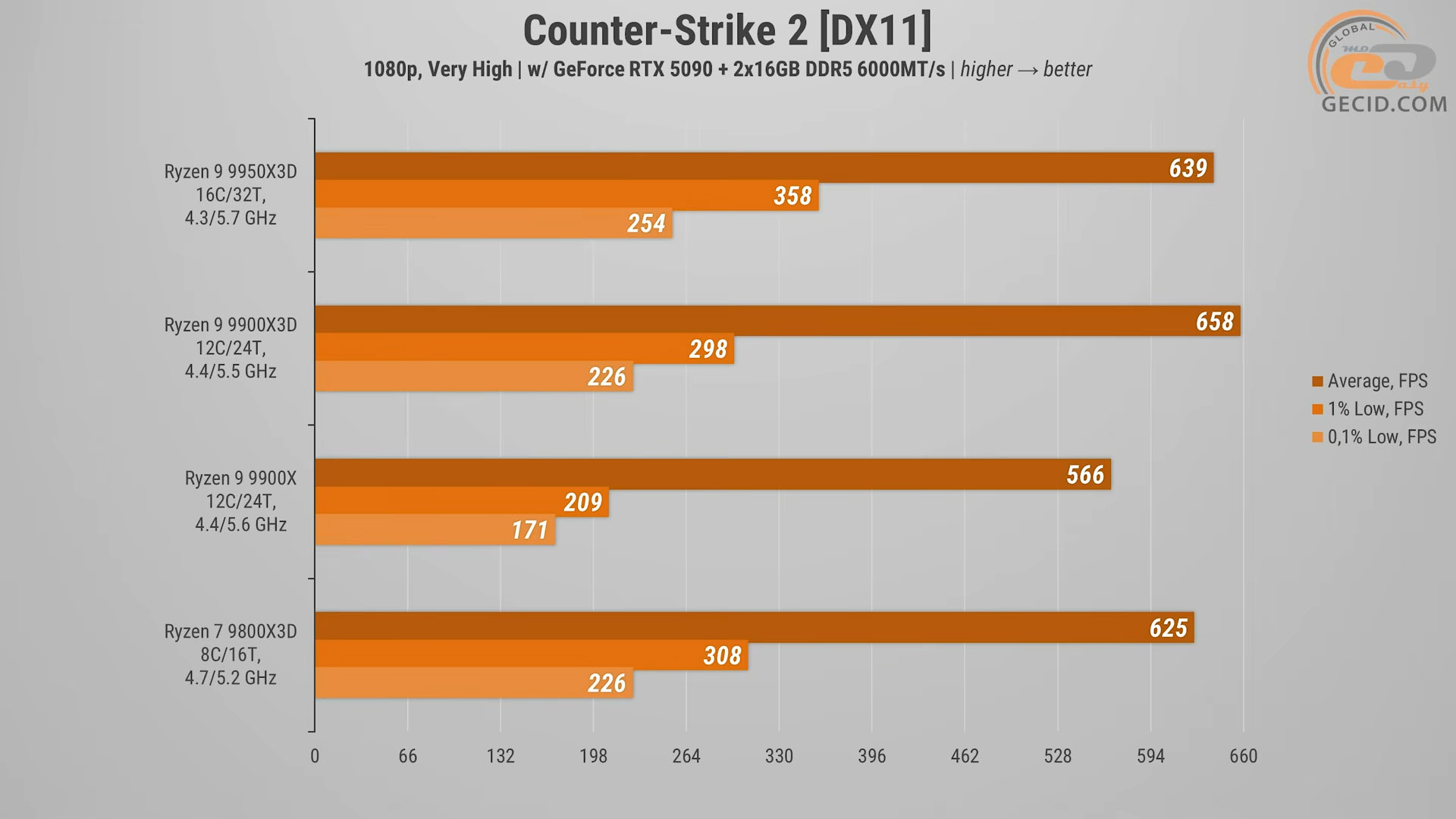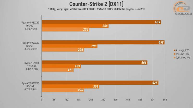 У CS2 жодних несподіванок — гра хоч і вимоглива до процесора, але CPU такого рівня впевнено видають понад 550 середніх FPS, тож навіть найвимогливіші гурмани залишаться задоволеними. На цьому фоні Ryzen 9 9900X3D просто блиснув і забрав собі перемогу: він опинився трохи попереду 9800X3D і помітніше жвавіше звичайного 9900X.