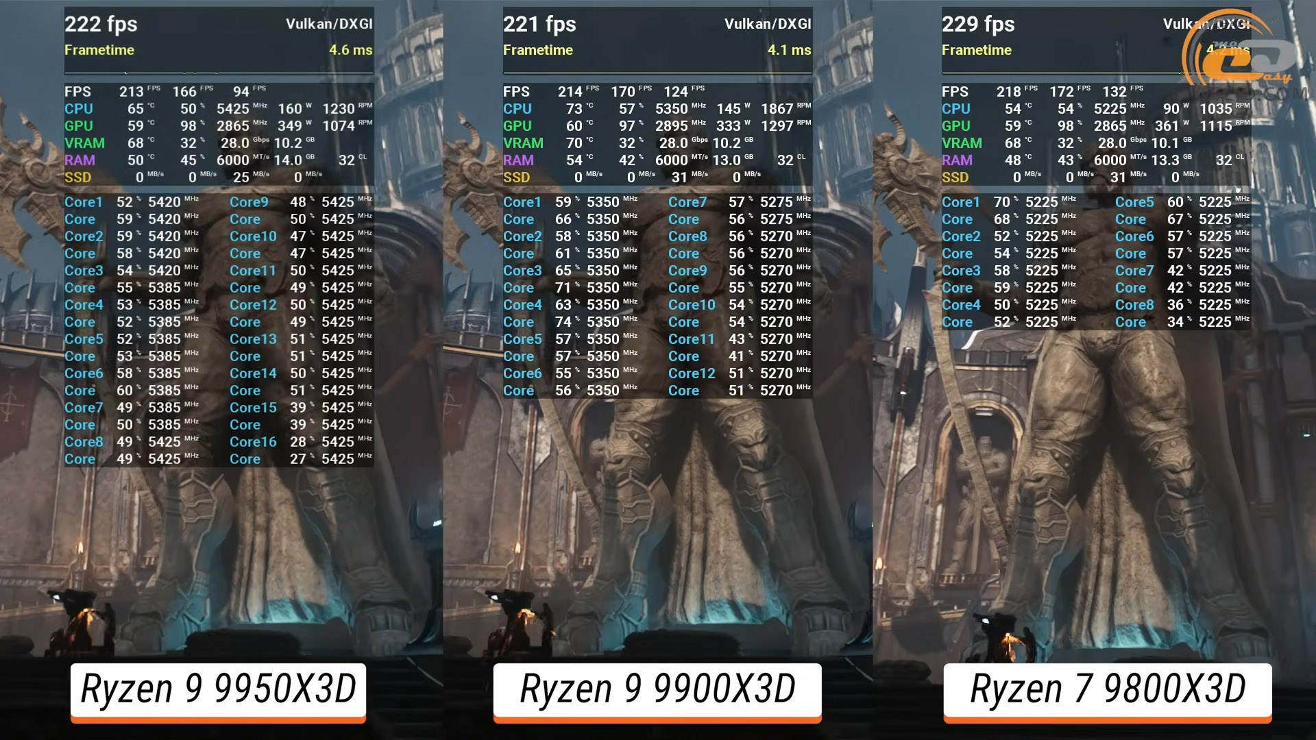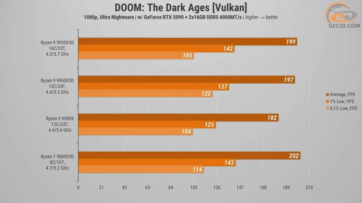 Насичений хаосом бенчмарк в DOOM: The Dark Ages при «Ультра кошмарній» картинці краще усього підкорився одночиплетній моделі — Ryzen 7 9800X3D. Саме йому вдалося показати більше ніж 200 середніх оновлень екрану за секунду.