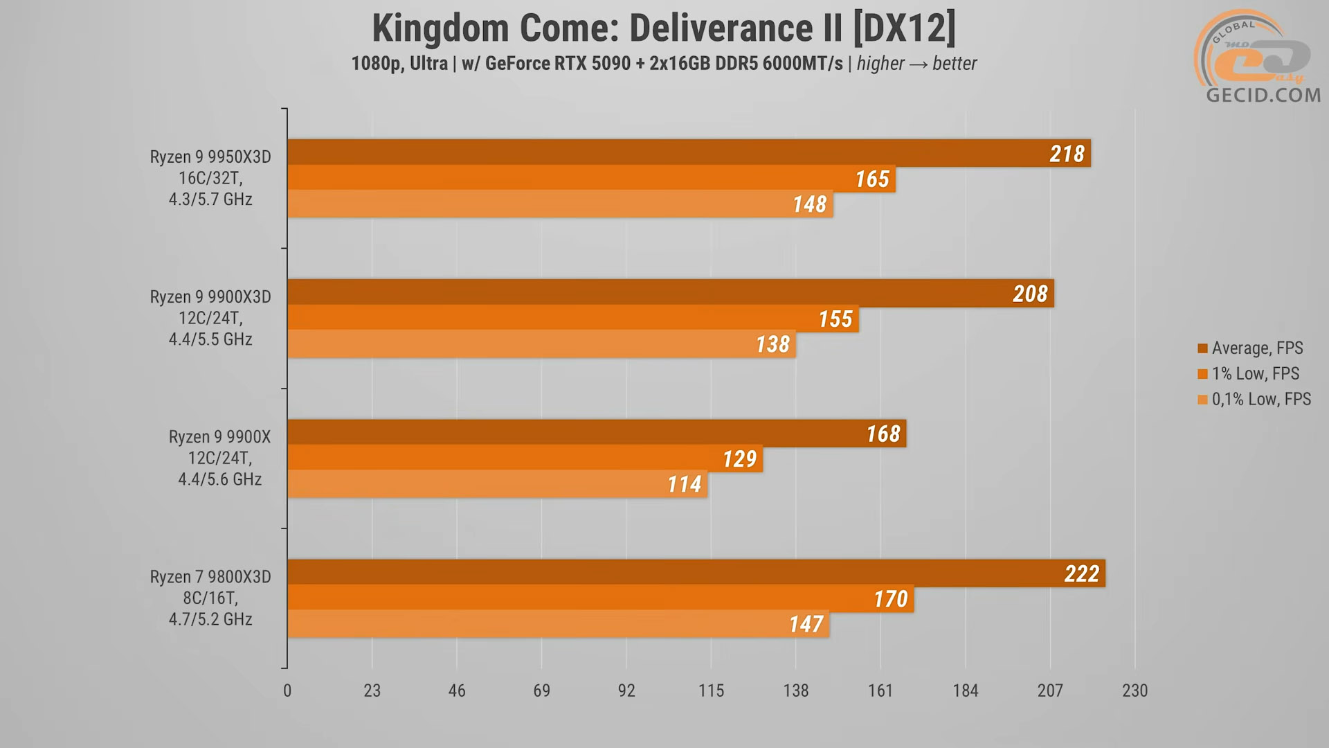 Під час тестування Kingdom Come: Deliverance II на ультрах першу сходинку намагалися поділити Ryzen 9 9950X3D та Ryzen 7 9800X3D, проте другий все ж таки зміг одержати перемогу. Щодо нашого «спірного» воїна, то він показав результат гірший на 10 середніх кадрів за секунду, проте водночас навіть такий показник FPS виявився на 24 відсотки кращим за 9900X.
