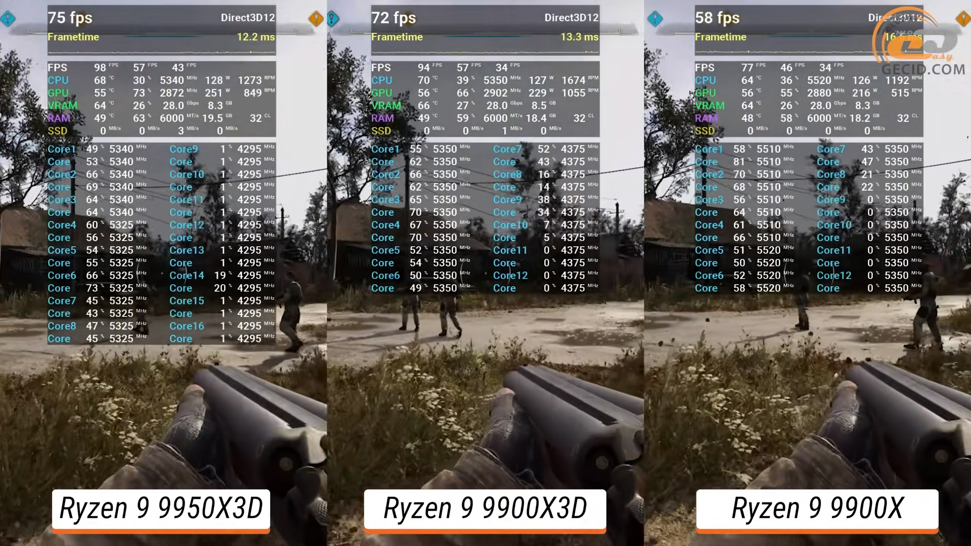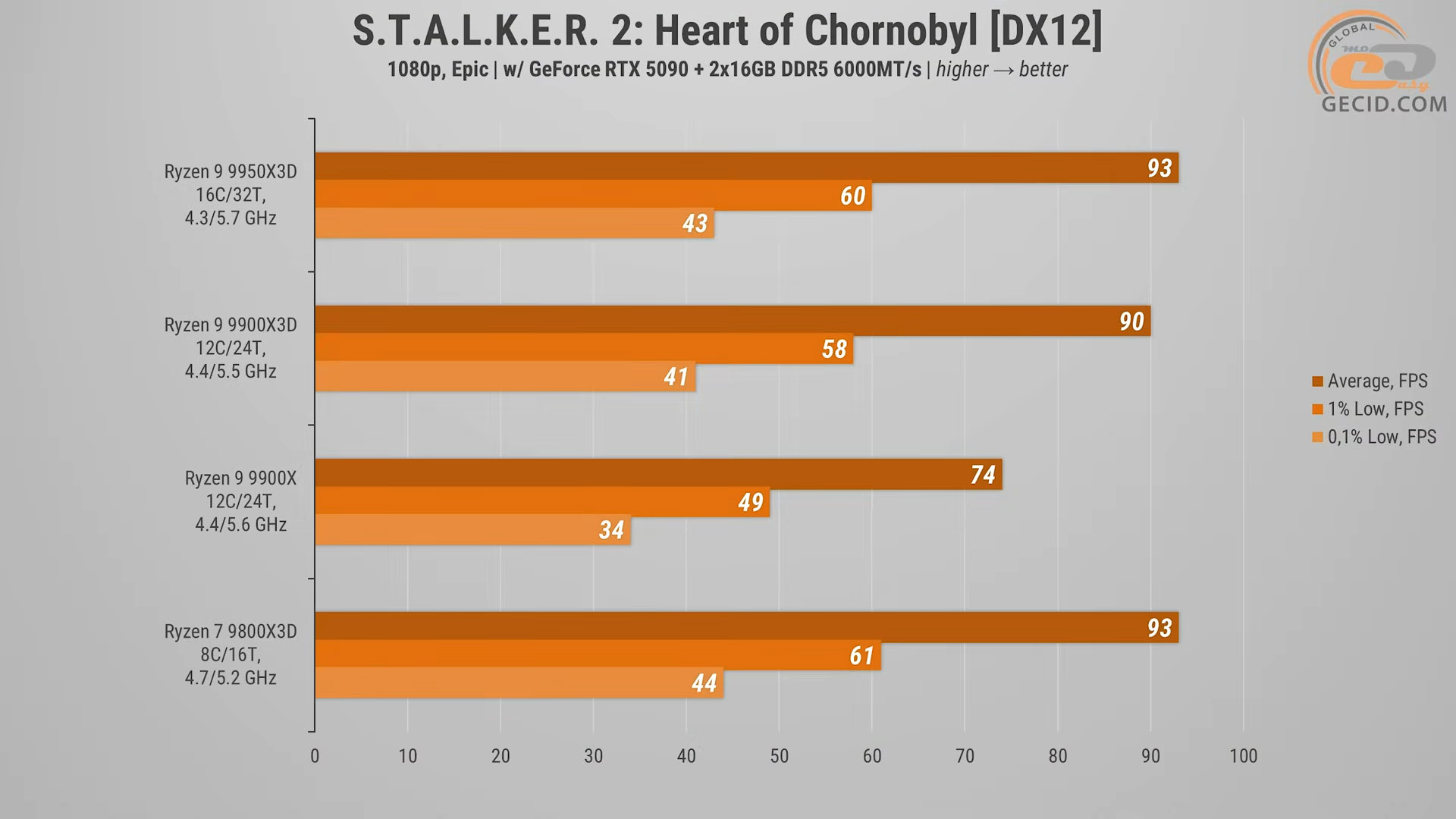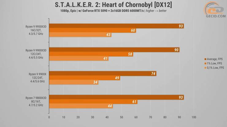 В S.T.A.L.K.E.R. 2 Ryzen 9 9900X3D виявився на 3 відсотки слабкішим за 9950X3D та 9800X3D, які у свою чергу показали ідентичний по FPS результат. А простий 9900X закріпив свої показники біля відмітки у 75 середніх кадрів за секунду, що є на 20 відсотків гіршим результатом, порівнюючи із поліпшеною моделлю.