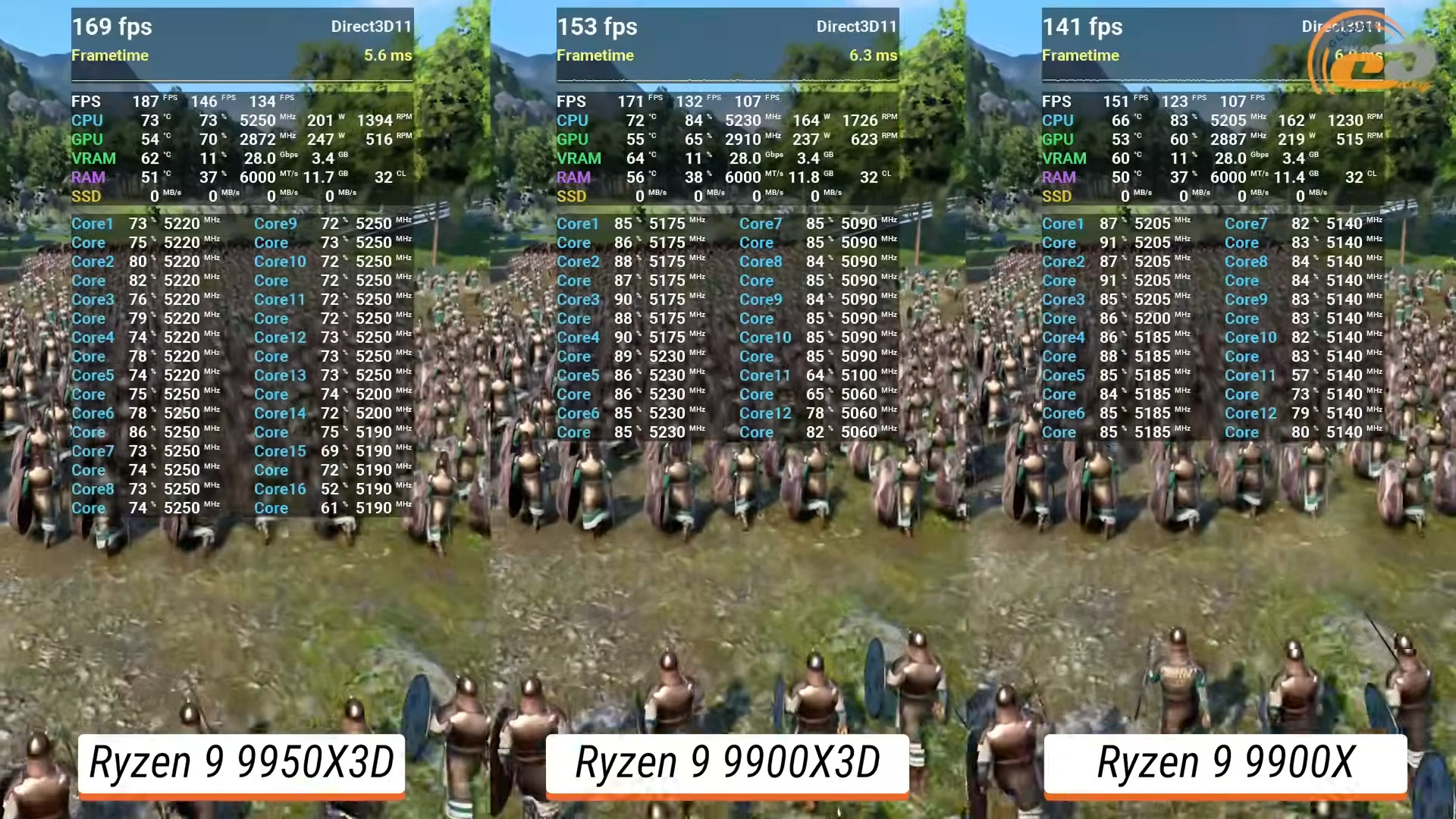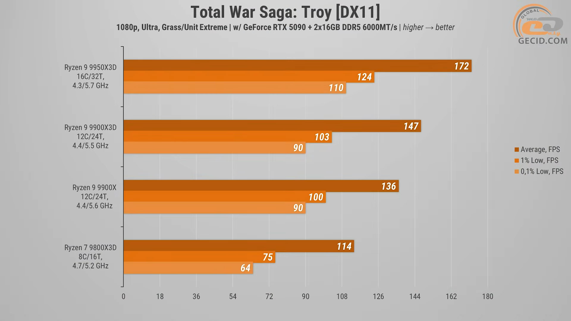 Завершуватиме тестування у Total War Saga: Troy, яка традиційно добре навантажує процесор, особливо у великих битвах. Тут Ryzen 9 9900X3D показав себе дуже переконливо. Він суттєво обходить звичайний 9900X, додаючи близько 8% продуктивності під час гри.