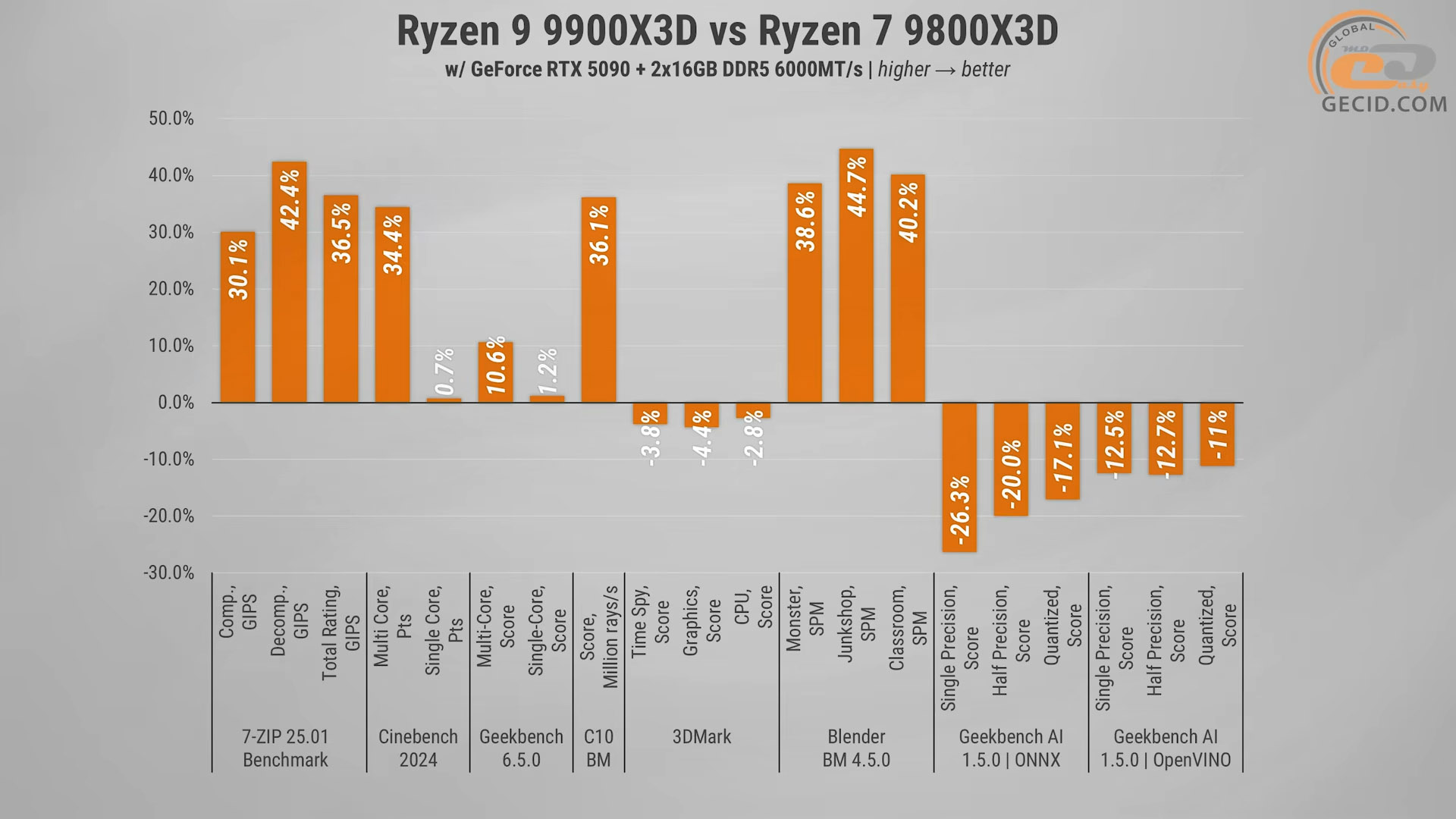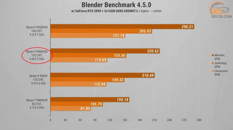 Зате порівняння з 9900X вийшло більш цікавим. Наш герой випереджає його на від 1.5% до майже 5, залежно від сцени — тож 3D-кеш у Blender таки приносить деяку користь, хоч і без кардинального розриву.