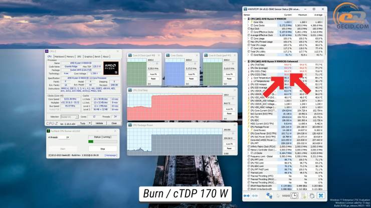 Якщо ж збільшити cTDP до рівня 170 Вт, то вдається розгледіти аж 95 та 92 градуси на двох чиплетах відповідно. У такому режимі процесор починає працювати на частоті у 5170 МГц, що змушує використовувати вже майже 230 Вт енергії.