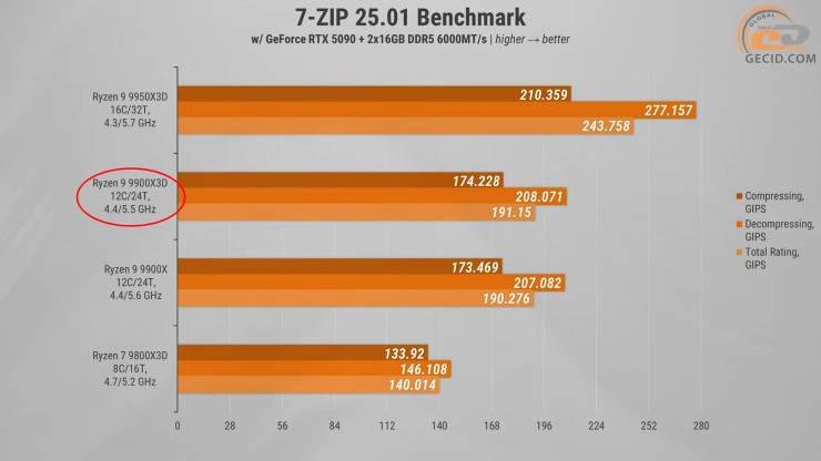У 7-ZIP Ryzen 9 9900X3D впевнено зайняв друге місце. Відставання від флагманського 9950X3D помірне — приблизно 20% у сумарному рейтингу, що для моделі з «урізаною» конфігурацією цілком логічно. При цьому відрив від звичайного 9900X майже непомітний і тримається в межах 1%. А ось проти 9800X3D піддослідний виглядає переконливо — попереду майже на 30%, що чітко відображає різницю у кількості ядер.