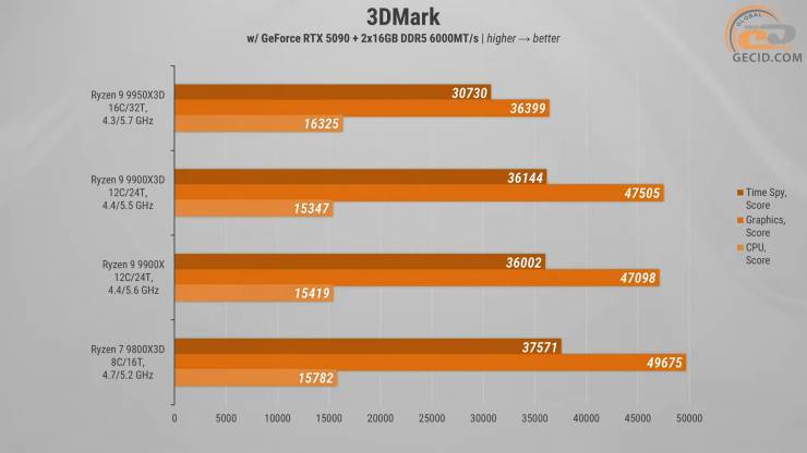 У 3DMark ситуація вийшла зовсім не такою прогнозованою, як у класичних CPU-бенчмарках. У процесорному підтесті Ryzen 9 9900X3D виглядає помірно: попереду звичайного 9900X, але з перевагою у пів відсотка. А от від флагмана він відстав уже доволі помітно — близько 17%, що логічно, враховуючи різницю у кількості ядер.