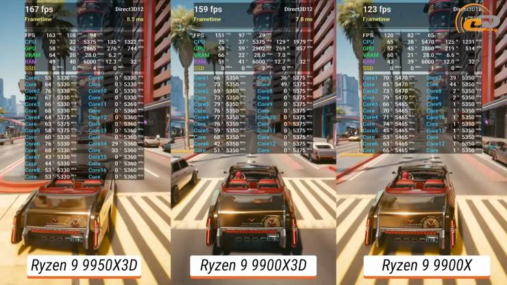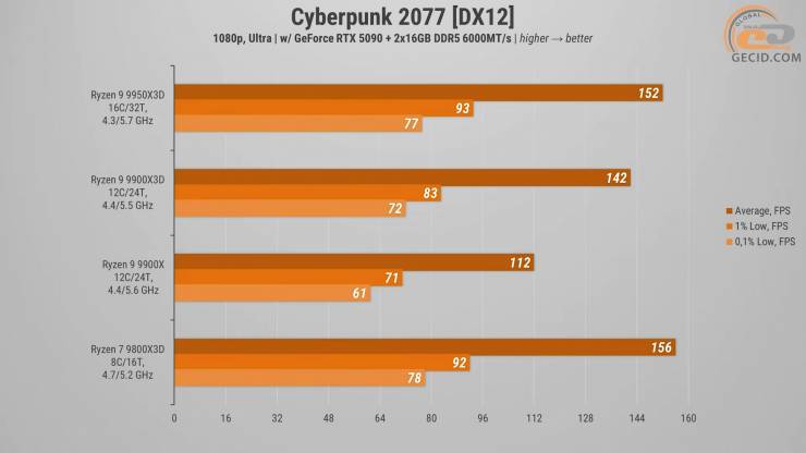 У Cyberpunk 2077 ситуація вийшла цікавішою. Попри більшу кількість ядер, Ryzen 9 9900X3D не зміг нав’язати боротьбу молодшому брату — Ryzen 7 9800X3D виявився попереду з відривом у 14 середніх кадрів за секунду.