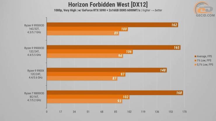 Під час пробіжки дивовижним парком у Horizon Forbidden West Ryzen 9 9900X3D знову демонструє досить впевнену форму — він обходить звичайний Ryzen 9 9900X приблизно на 12% за показником середнього FPS, що дозволить комфортніше тримати високу частоту кадрів на великих просторах гри.