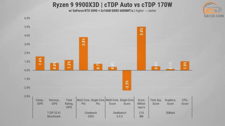 Окрім стандартного режиму, ми додатково перевірили користь від збільшення cTDP до 170 Вт. Помітне збільшення енергоспоживання лише у деяких синтетичних тестах забезпечило прискорення на 4-5%, зазвичай результат значно скромніший, а іноді і взагалі від’ємний, адже CPU стає гарячіше і він дещо скидає робочі частоти.